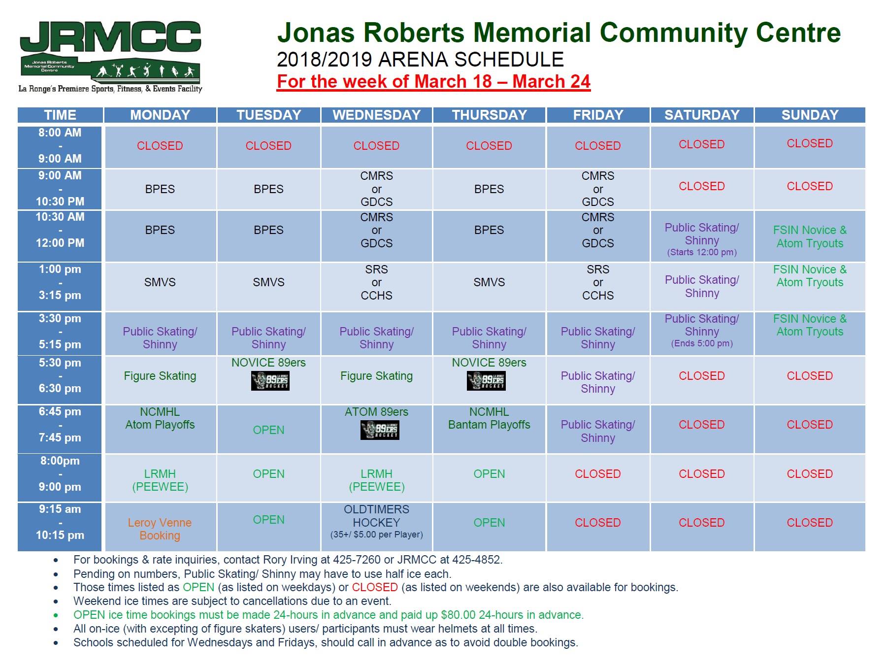 By JRMCC Rink Rink Schedule Rink Schedule until March 24 Mar 18, 2019 | 12:52 PM Share on Facebook Share on Bluesky Share on X Copy Link See the poster below for all the great activities booked into the JRMCC Rink.