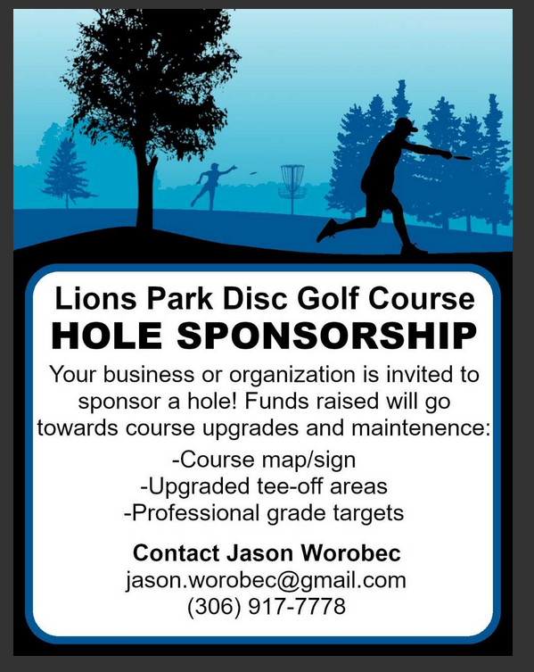 We are also launching a hole sponsorship fundraiser. This is to gather funds to pay for upgrades and maintenance required to the current disc golf course in Lions Park.