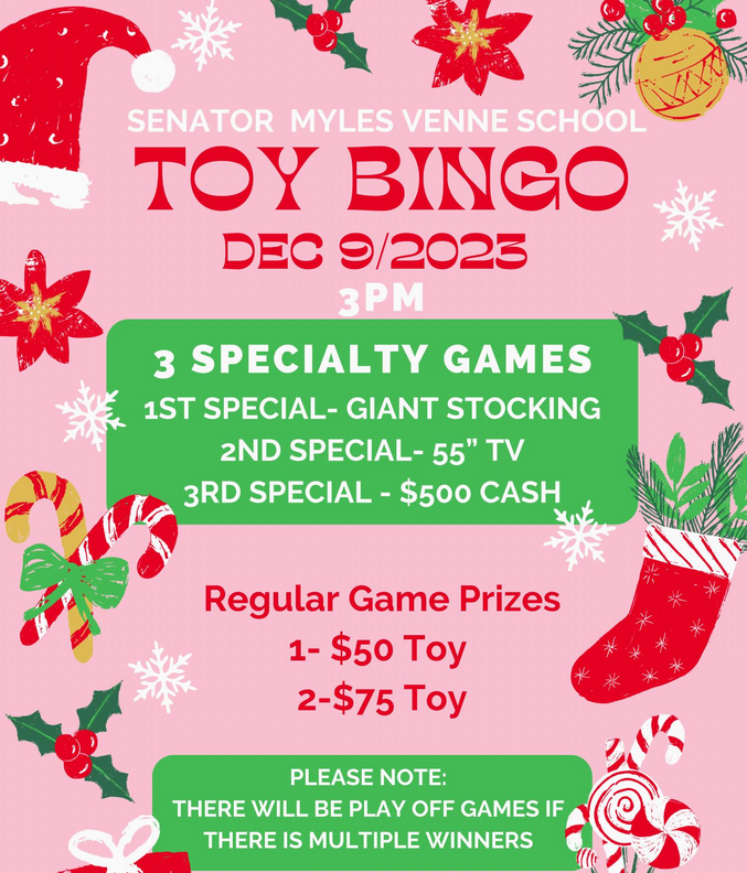 Senator Myles Venne School will be hosting a Toy Bingo December 9 at 3 p.m.