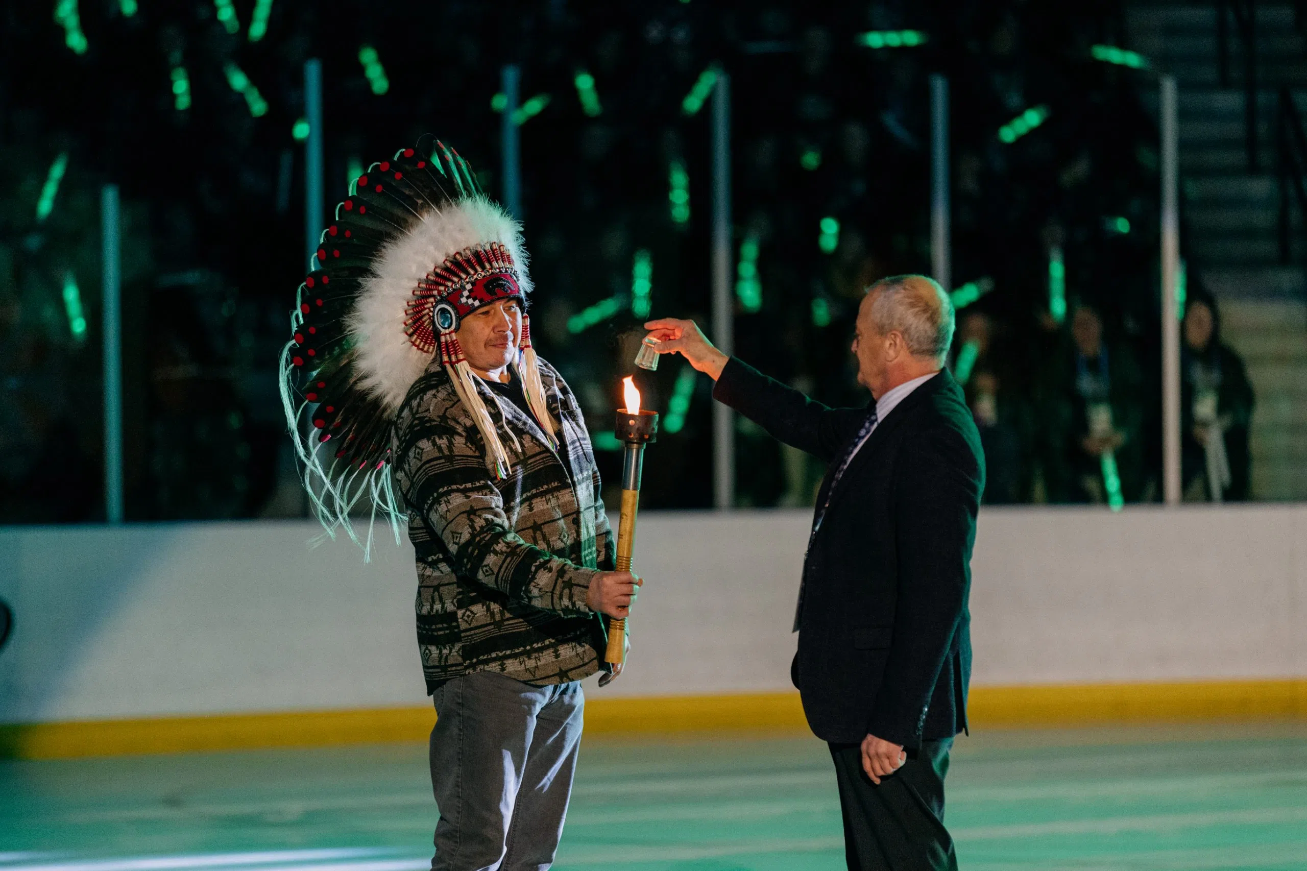 Meadow Lake Mayor Merlin Seymour extinguishes the ceremonial flame while Flying Dust First Nation Chief Tyson Bear holds the torch during the closing ceremony of the 2026 Saskatchewan Winter Games at the Co-op Centre in Meadow Lake on Saturday, Feb. 21, 2026. (Image Credit: Saskatchewan Games Council)