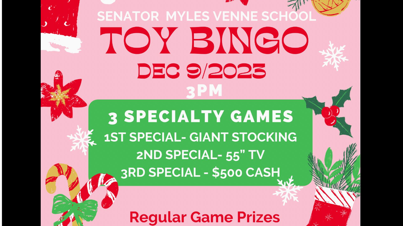 Senator Myles Venne School will be hosting a Toy Bingo December 9 at 3 p.m.See the poster for details.