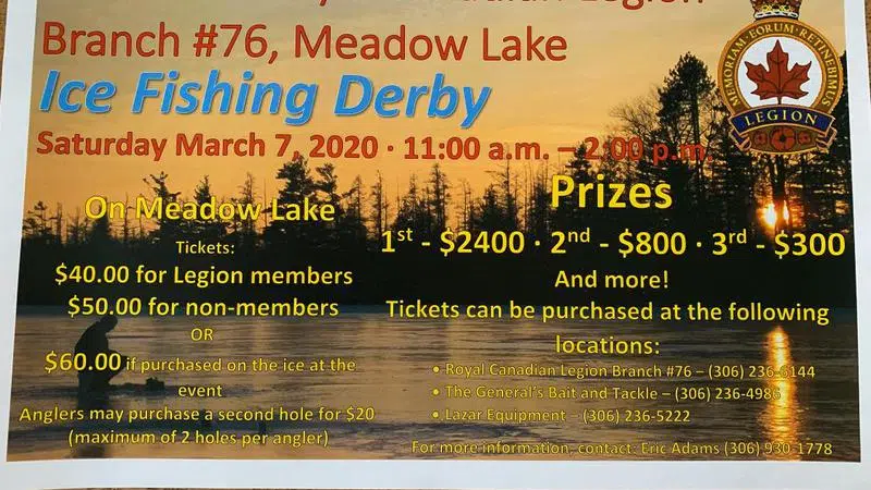 The Royal Canadian Legion #76 is hosting its 4th Annual Ice Fishing Derby on Saturday, March 7 from 11:00 a.m. until 2:00 p.m. on Meadow Lake.The Grand Prize is $2,400.Get your tickets before the even...