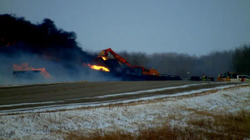 Dec 18, 2019 Crews work to contain burning oil tankers after a CPR train derailed and caught fire near Plunkett on Dec. 9th, 2019. (Brent Bosker/650 CKOM)